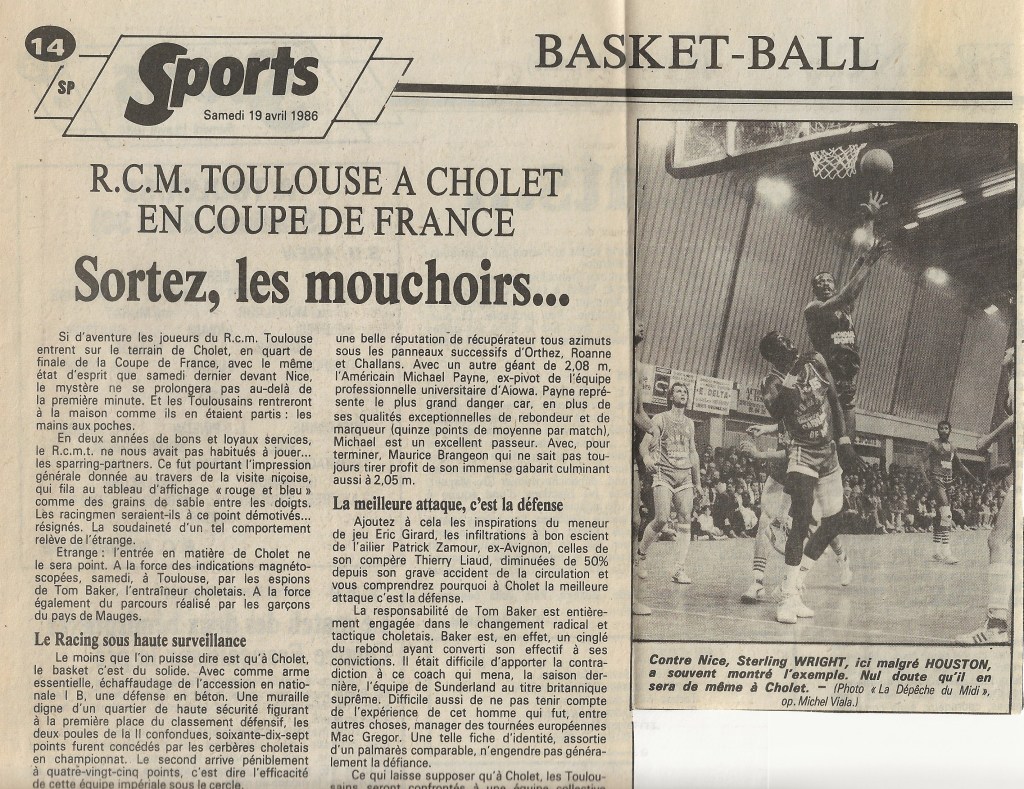 Après avoir éliminé consécutivement quatre équipes de Nationale III, le RCMT va avoir un tirage au sort beaucoup moins clément: c’est désormais Cholet qui se dresse sur le parcours des toulousains. L’équipe du Maine-et-Loire poursuit sa fulgurante ascension, qui l’a menée depuis sa création 11 ans plus tôt, du plus bas échelon départemental vers le niveau professionnel. En 1985-86, Cholet termine 1er de la Poule B du championnat de France Nationale II, et remporte face à Nice le titre de Champion de France de cette division. On connait la suite, le club des Mauges est solidement accroché à l’élite depuis cette époque, et aura sorti de nombreux joueurs de très haut niveau, d’Antoine Rigaudeau à Rudy Gobert en passant par Nando De Colo ou Jim Bilba notamment.